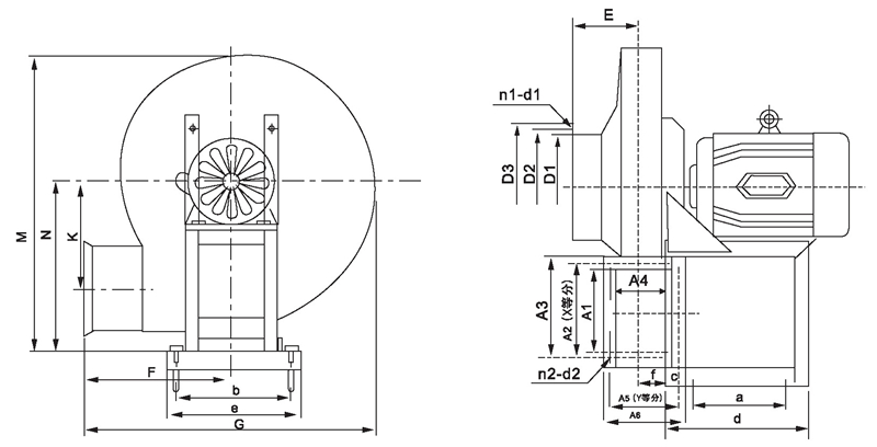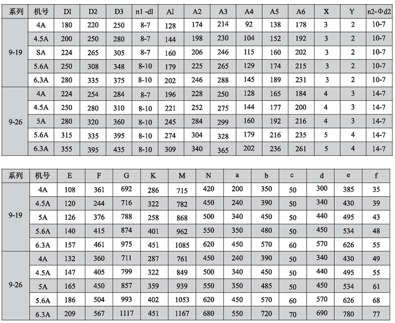 9-19、9-26系列7.1D~16D離心風(fēng)機(jī)外形尺寸圖、表